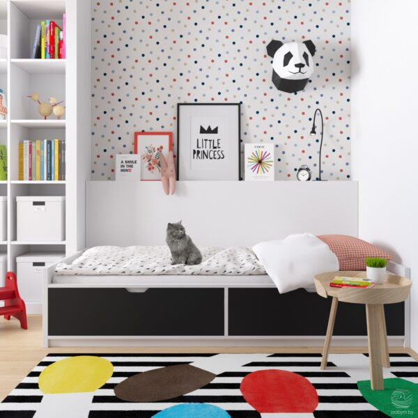Black isn’t too dark of a color in a kid’s room if you balance it with lighter shades. Above this black wall, which could be a chalkboard wall, is a fun gray plaid wallpaper. Since it’s only on one wall, it fits in perfectly and doesn’t make the space feel small.
