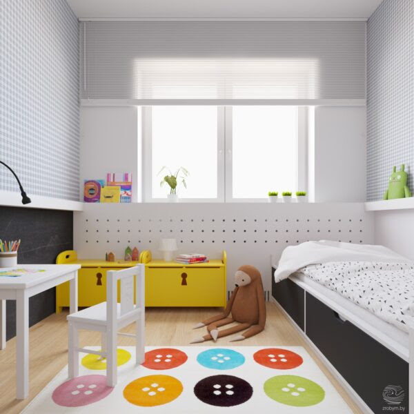 Sometimes when you have children it can be difficult to design a stylish home that’s accommodating. This beautiful three bedroom and two bathroom house doesn’t skimp on chic! Designed by Iryna Sotnikava from Minsk, Belarus, this home utilizes grays, whites, and yellows. After you look through these exciting images of the home, you’ll learn that you only need one bright accent color to bring excitement to a space. Why not make that color a vibrant yellow? From the living room with a yellow banana throw pillow, to the master bedroom which has a yellow painted closet door, you’ll find sunny surprises at the turn of every corner!