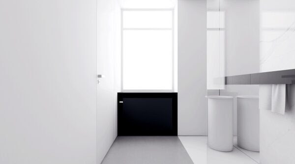 An almost all-white bathroom with shocking stripes of black keeps the minimalist theme. A black cabinet and shelf stretch across lightly-marbled walls. Wide, open-paned windows show a lighter version of white.