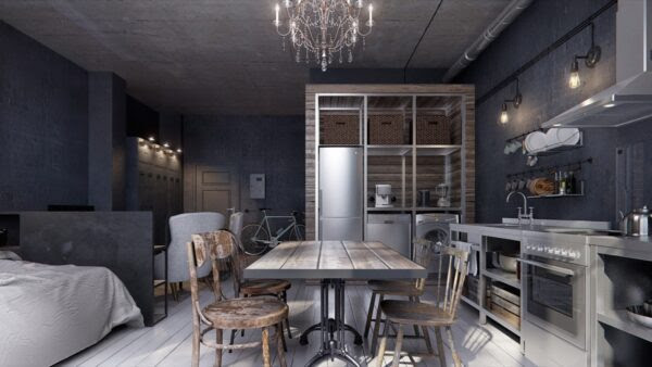 A line back to a black hallway makes an interesting entrance for the interior. Forming a larger square space, black-painted school lockers provide storage beside a bicycle. The trend is carried through in the wider kitchen space, featuring industrial-looking appliances, an extractor fan and white chef benching. Distressed wood frames the units and walls, as a dining set in the same material continues on the theme. Smaller features in black painted piping and utensil racks keep the costs down while remaining true to the look.