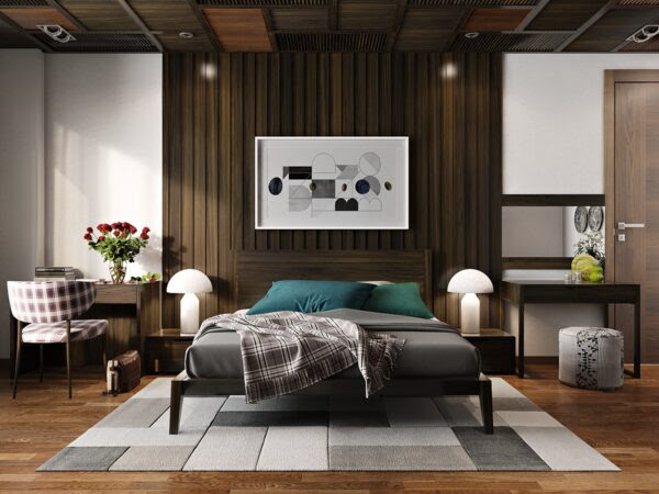 These dark slats are contrast to the white walls of the rest of the room and match the bed. The two mirrors add depth to the room. While the light fixtures are an exquisite addition to the dignified atmosphere of the room.