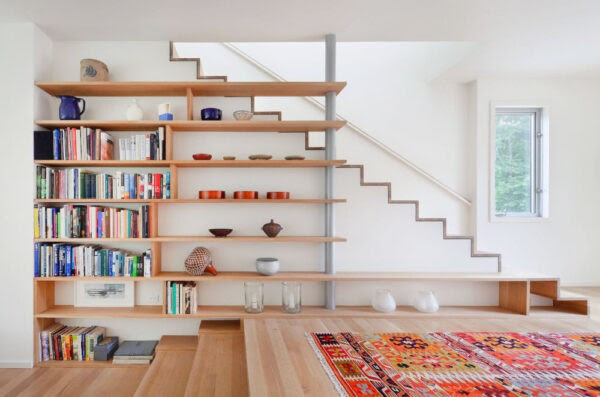 Make your staircase seem minimal, with overlapping library shelving. Simple Scandinavian panels hide books and vases, offering a seat to visitors before the climb.