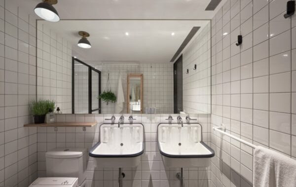 A custom black shower and industrial hand-washing sinks with chrome fittings carry the industrial concept into the bathroom. Floating vanities ensure additional floor space, making the bathroom seem bigger.