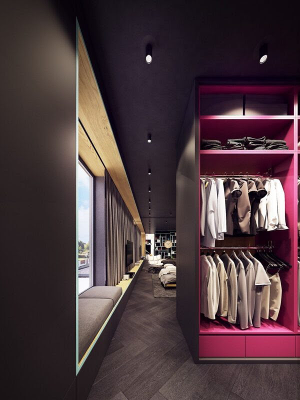 If these closets were completely dark, this wardrobe would look like a punk rock dream. Instead, the astute designers removed the cupboard doors and substituted the dark interior for a vibrant and cheery color, that didn’t detract from the sophistication of the room. A narrow strip of skylight opens the room to the sky and provides some much needed air and space. No one has ever felt claustrophobic by looking up at the sky.