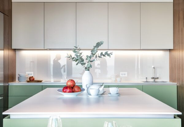All white dishware keeps the look fresh and crisp. A simple sprig of greenery brings the botanical theme into the kitchen. Lighting placed under the cabinets help while cooking and create a fabulous ambiance.
