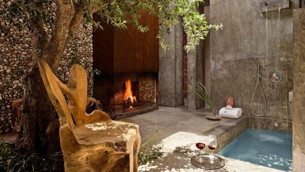 For an outdoor shower that screams luxury, Fiji’s Tadrai Island Resort has the answer. An open slatted roof lets in palm trees outside, while an unusual tree grows in the centre. Take a shower underneath its branches, while a stone spa awaits.
