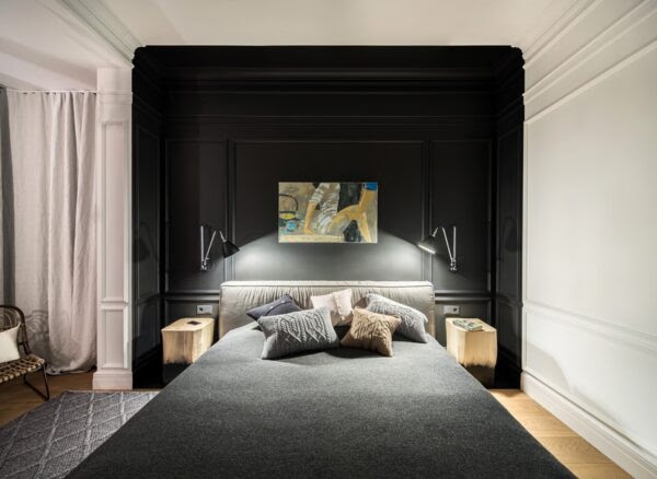 These designer bedside tables merge two design concepts together. The wooden piece warming up the dark surroundings, but the black paint at the bottom joins it to the accent wall.