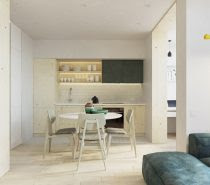 Storage is always a question to address in a studio like this one, which measures just 22 square meters, but this lofted storage area is a creative and stylish solution.