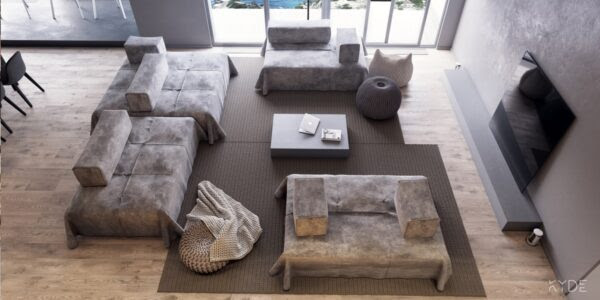 The 160 square meter (1722 square feet) home features a large gray modular sofa in the main living area.