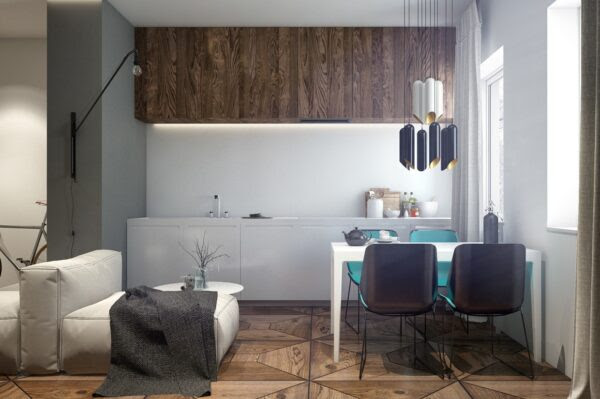 Our third space, another from Kiev, Ukraine, is a smaller proportioned 87 square meter apartment. Here we see a shrunken seating area in a studio kitchen setting.