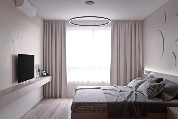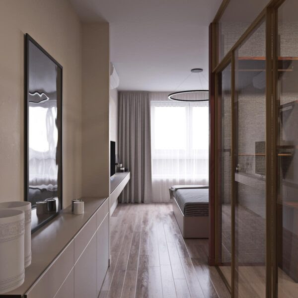 The bedroom reveals another feature colour – terracotta red. Staking out a full wall, its two canvases provide the room with colour, referenced by a small portrait on the bedside ledge. Lit by two small wall sconces, the ledge lifts up to engraved-look circular decals and a ring light pendant. Marking out the centre, the pendant segues the mirroring TV ledge, grey-and-white bedding and wall motifs. Beige wooden flooring, full-height curtains and stone-hued ledges soften the mood for sleeping.