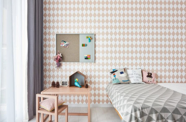 As white chiffon curtains open out to the sky, the light-wooden floor allows space for play time. A round beige mat holds polka dots and a mini tent. Statement wallpaper holds a cork board, desk and chair, a cute combination that grows with the child.