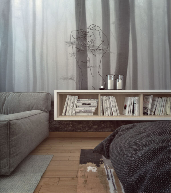 The second small apartment kicks off with a dramatic shadowy tree mural situated right behind the sofa. Teamed with an open flame on the coffee table, this decor evokes a feeling of the great outdoors and camping adventures.