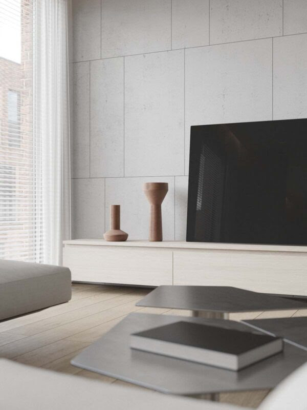 With the white palette and large picture windows, the living room feels quite spacious horizontally.