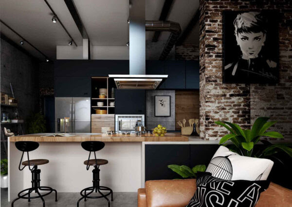 The differing tones of exposed brick work creates interest in the rest of the open plan industrial home, which we can see continued up on a mezzanine level.