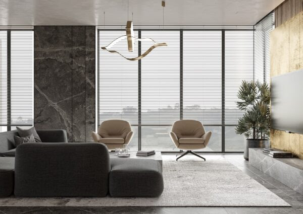 A pair of matching, modern armchairs offer even more seating against a backdrop of floor-to-ceiling windows.