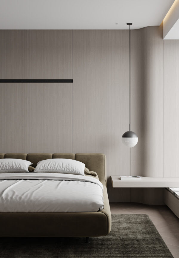 A built-in bedside table seamlessly navigates a curved wall treatment. A globe pendant light falls above it.