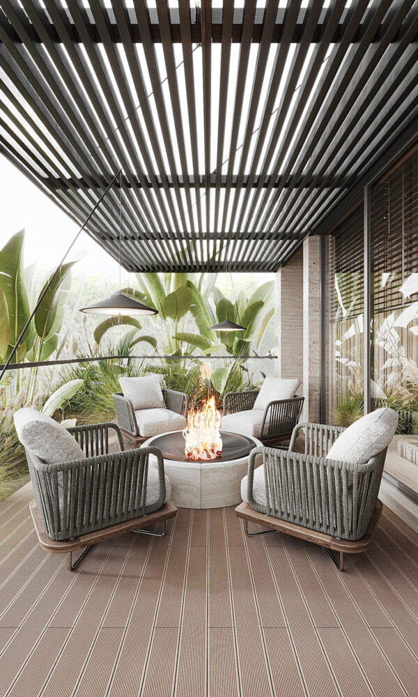 Out on the terrace, a firepit roars at the centre of a cosy outdoor chair arrangement.